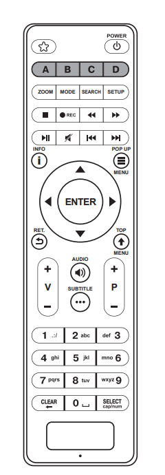 SUBTITLE, ZOOM, MODE, SEARCH, SETUP — control the playback and some other player